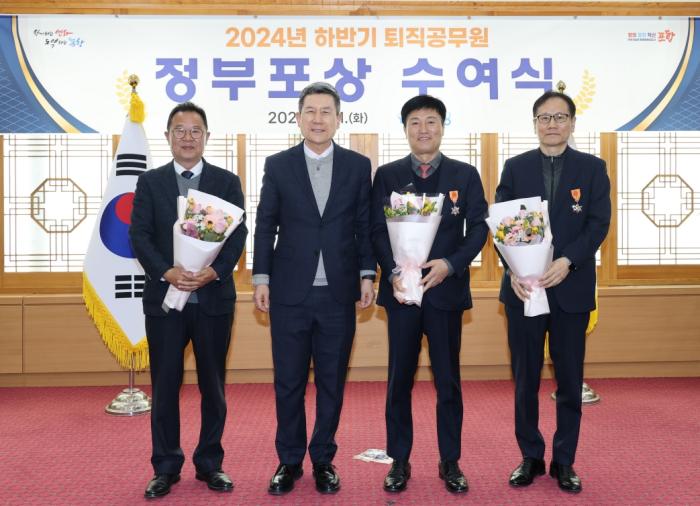 | 포항시는 11일 시청 대외협력실에서 ‘2024년 하반기 퇴직자에 대한 정부포상 수여식’을 개최했다. (왼쪽부터 유욱재 前 농업기술센터소장, 이강덕 포항시장, 최창호 前 연일읍장, 권의진 前 죽도동장)/포항시 제공 |