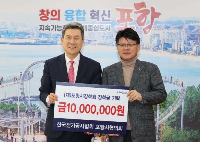 포항시는 한국전기공사협회 경북도회 포항시협의회(회장 김경수, ㈜신풍이엔지)가 14일 포항시청을 방문해 지역 인재를 위한 장학기금 1,000만 원을 기탁했다고 밝혔다.