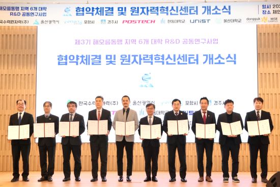 경주‧울산‧포항 해오름동맹도시와 한국수력원자력이 25일 포항공대에서 열린 원자력혁신센터 개소식에서 연구개발 공동연구 협약식을 가졌다.