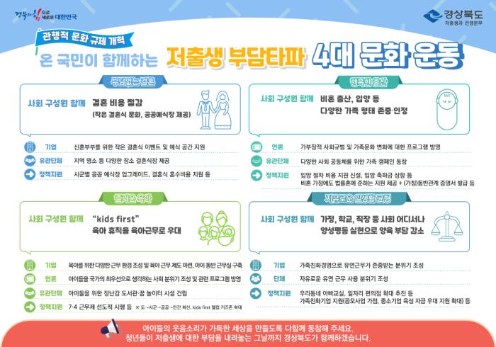 경북도는 저출생 부담 타파 4대 문화 운동을 민간 주도 저출생 극복 추진본부와 협업해 확산시키고 카드뉴스 콘텐츠 제작 배포, 사회관계망서비스(SNS) 챌린지, 팝업 이벤트 등도 진행할 계획이다.