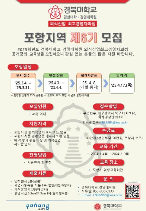 자세한 문의사항은 경북대학교 경영대학원 행정실(☎053-950-6133) 및 포항시청 식품산업과(☎054-270-3544)로 연락하면 된다.