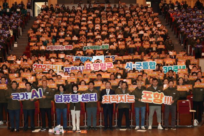 특히 이날 행사에서는 포항시 주요 시책 중 하나인 ‘국가 AI 컴퓨팅센터 포항 유치’ 퍼포먼스를 선보이며, 국가 AI 컴퓨팅센터 유치를 희망하는 시민들의 마음을 하나로 모았다.
