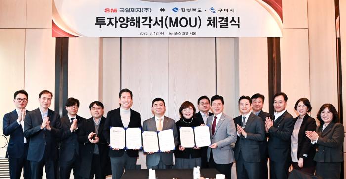 경북도와 구미시는 12일 서울 포시즌즈 호텔에서 특수지 및 산업용지 전문 제조기업 SM국일제지(주)와 구미시에 통합공장 설립 추진을 내용으로 투자 양해각서(MOU)를 체결했다.