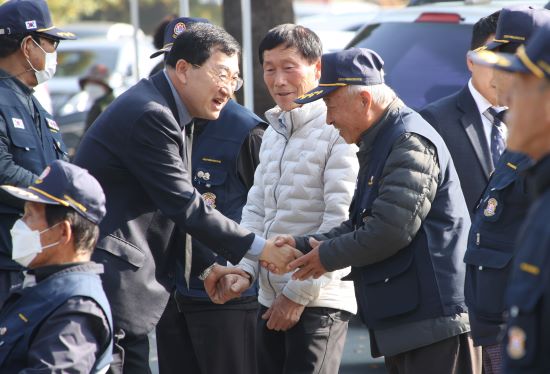 2022년 11월 2일 황성공원에서 열린 ‘제2회 6.25 월남전 참전자 명예선양 행사’에서 주낙영 시장이 참전유공자들과 인사를 하고 있다/경주시 제공