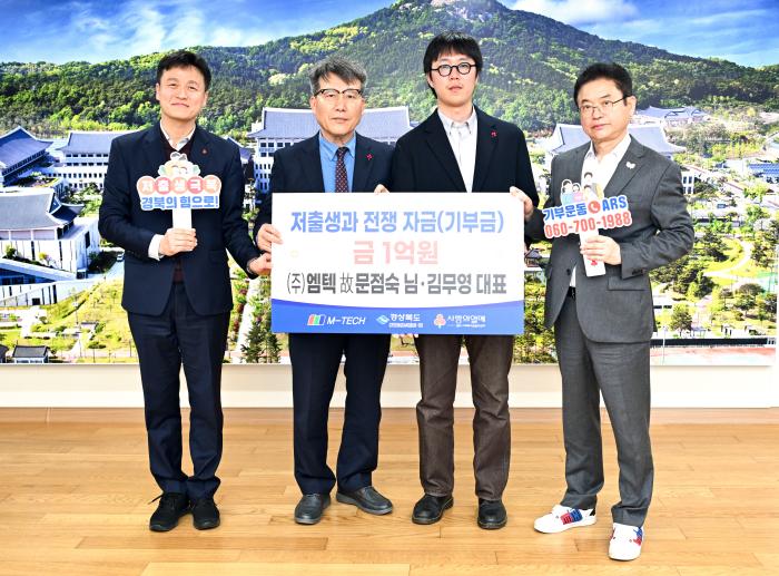 이철우 경북도지사는 “고인의 따뜻한 뜻에 따라 저출생 극복을 위해 1억원이라는 큰 성금을 맡긴 김무영 ㈜엠텍 대표님께 다시 한번 깊이 감사드린다”며 “저출생과 전쟁 시즌2를 맞아 올해는 결혼과 출산을 망설이는 세대를 위해 좀 더 피부에 와 닿는 정책을 꾸준히 추진하겠다”고 밝혔다.