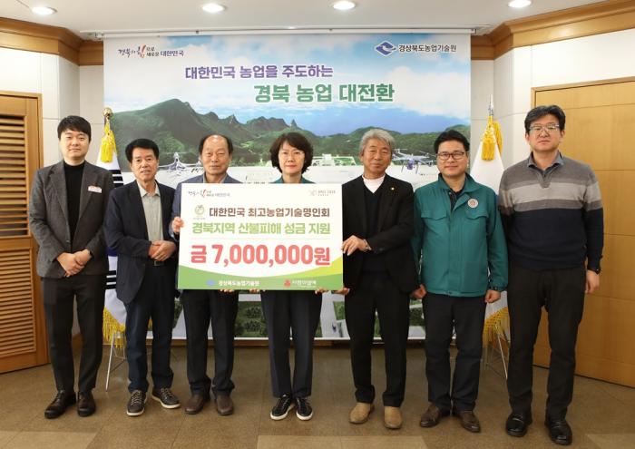 경북도농업기술원은 지난 3일 경북지역 대형산불로 인해 긴급 대피한 이재민 지원과 피해 복구를 위해 대한민국 최고농업기술명인회(회장 이명화)에서 모금한 성금 700만원을 경북사회복지공동모금회에 기탁했다고 6일 밝혔다.