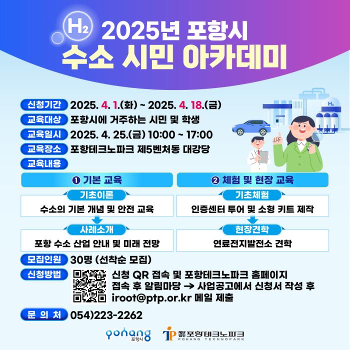 포항시와 포항테크노파크는 시민들의 수소에너지에 대한 이해도를 높이고 친환경 에너지 전환을 촉진하기 위한 ‘2025 포항 수소 시민 아카데미’의 교육생을 모집한다고 7일 밝혔다.