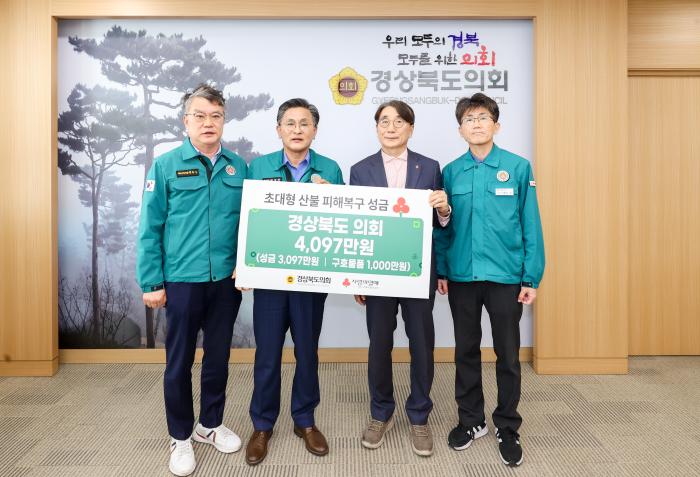 이번 성금과 구호물품은 경북도의회 전체 의원들과 의회사무처 전 직원들이 자발적으로 참여해 모금한 성금 2,097만 원, 대한민국시도의회의장협의회 재난구호금 1,000만 원, 그리고 이재민 지원을 위한 1,000만 원 상당의 긴급 구호물품으로 구성됐다.