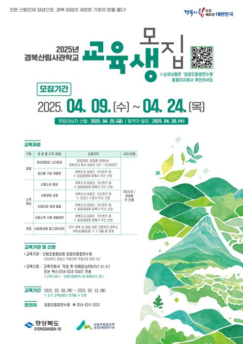 경북도는 9일부터 16일간 경북 임산업 경쟁력을 높이고 산촌 경제 활력을 주도할 2025년 경북산림사관학교 교육생 175명을 모집한다.