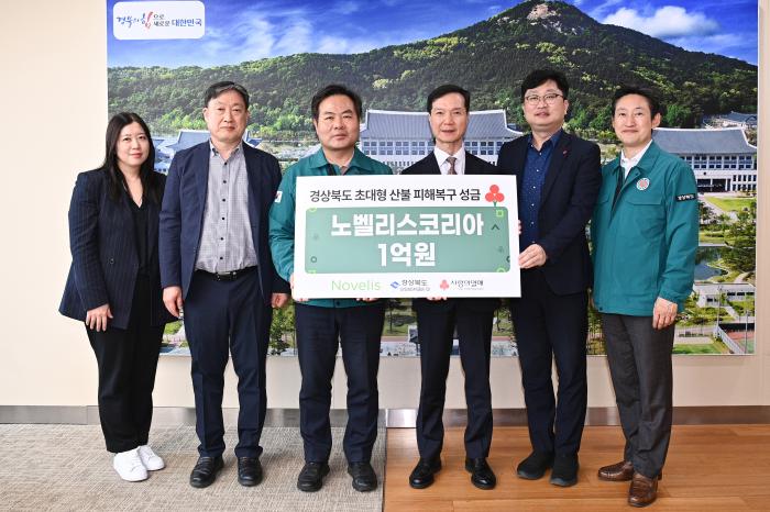 노벨리스코리아 박종화 대표와 임원이 9일 경북도청을 방문해, 김학홍 행정부지사, 경북사회복지공동모금회 관계자들이 참석한 가운데 산불 지역 피해 복구와 이재민들을 위해 성금 1억원을 기탁했다.