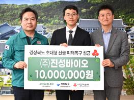 경북도는 ㈜진성바이오가 지난 10일 경북도청을 방문해 김학홍 행정부지사, 경북사회복지공동모금회 관계자 등이 참석한 가운데 산불 피해 복구 성금을 전달했다고 11일 밝혔다.