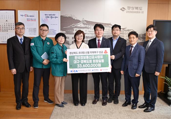 한국정보통신공사협회 대구경북도회와 정보통신공제조합은 17일, 경북도청을 방문해 각각 3,360만원과 1,000만원, 총 4,360만원의 성금을 사회복지공동모금회를 통해 기탁하며 피해복구와 이재민 지원에 힘을 보탰다.