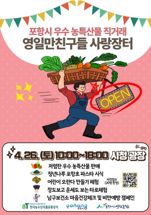 올해 사랑장터는 포항시와 포항시산림조합이 농림축산식품부와 한국농수산식품유통공사(aT)가 주관하는 ‘정례형 직거래장터 지원사업’ 공모에 선정돼 이와 연계해 운영된다.