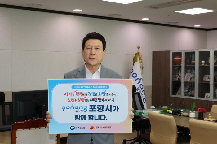 이강덕 포항시장이 21일 ‘인구문제 인식 개선 릴레이 캠페인’에 참여하며, 저출생·고령화 등 인구문제에 대한 사회적 공감대 확산에 힘을 보탰다.