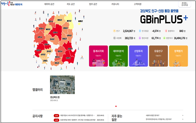지비인플러스는 경북도와 22개 시군이 공동으로 활용하는 광역-기초 통합 행정 플랫폼으로, 인구·산업·공간정보 등 다양한 데이터를 연계해 행정 협업과 효율화를 지원하는 시스템이다.