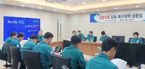 군청 재난안전상황실에서 개최된 이날 보고회는 이한경 행정안전부 재난안전관리본부장, 김학홍 경북도 행정부지사 등 중앙부처와 지자체 주요 관계자 20여 명이 참석한 가운데 이승택 청송군 부군수가 산불피해 복구진척상황 보고와 향후 계획을 설명하고 중앙정부의 적극적인 지원을 건의했다.