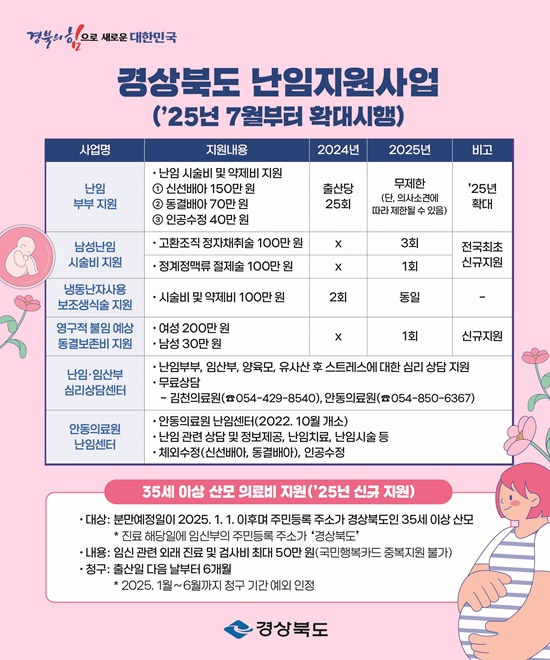 난임 시술 확대 지원은 난임 부부들이 가장 많이 요청한 사업으로 경북도가 꾸준히 건의해 5월 말 정부의 협의를 받아 시행하게 되었으며, 해당 검사비 지원은 7월 1일부터 신청할 수 있다.