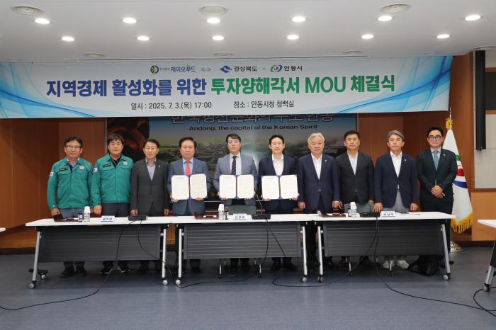 경북도와 안동시는 3일 안동시청 청백실에서 ㈜제이오푸드와 총 87억 원 규모의 식육·식품 제조공장 신설을 위한 투자 양해각서(MOU)를 체결했다고 4일 밝혔다.