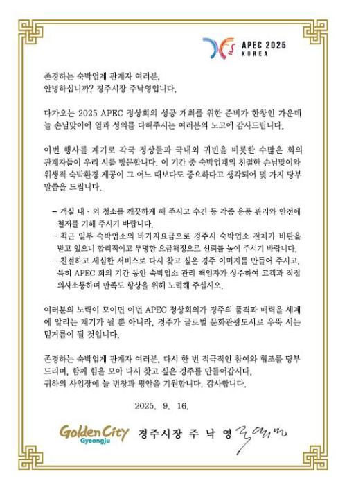 경주시가 APEC 정상회의의 성공적인 개최를 위해 지역 내 숙박업소 대표들에게 손님맞이 협조를 요청하는 서한문을 발송했다고 17일 밝혔다.