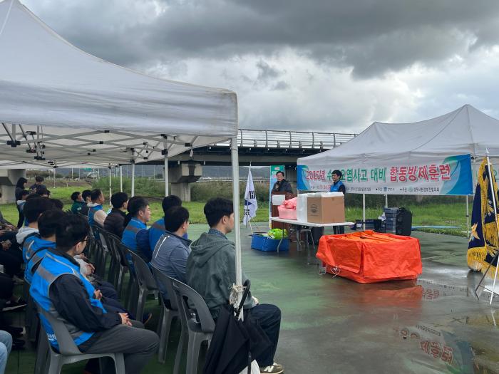 훈련은 유류 운반차량의 교통사고로 경유 약 100리터와 엔진오일이 하천에 유출된 상황을 가정해, 방제장비를 활용한 오염 확산 차단과 긴급 방제조치를 실전과 같이 진행했다.