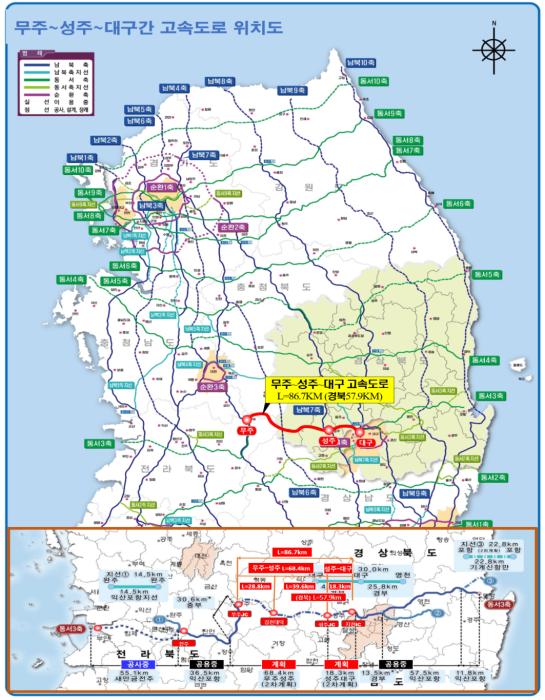이번에 선정된 무주~성주~대구 간 고속도로는 동서3축의 유일한 단절 구간으로서 왕복 4차로 86.7㎞를 건설하는 사업으로 7조여원이 투입되는 대형 SOC사업이다.