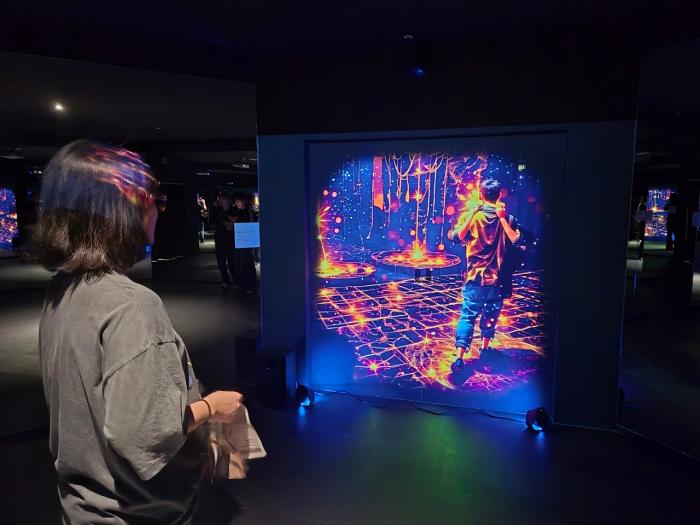 | AR그래픽과 실내 조명이 어우러진 용화향도 시즌2 체험 공간에서 방문객이 몰입형 전시를 즐기고 있다 |