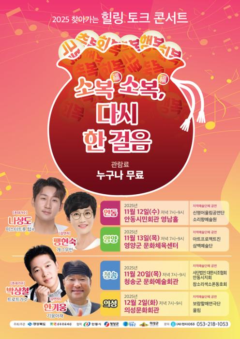 경북도와 경북문화재단은 상반기 대형 산불로 큰 피해를 본 안동, 영양, 청송, 의성 지역민을 위로하기 위한 치유형 문화예술행사 ‘찾아가는 힐링 토크 콘서트-소복소복, 다시 한 걸음’을 개최한다.
