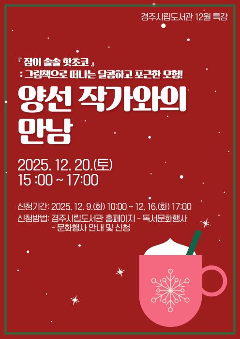 | 경주시립도서관이 12월 20일 개최하는 양선 작가와의 만남 홍보 포스터 /경주시 제공 |
