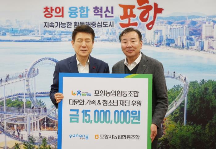 포항시는 16일 포항농업협동조합(조합장 최동관, 이하 포항농협)과 시청 대외협력실에서 취약계층 및 다문화가족, 교육소외 청소년의 안정적 정착과 자립 지원을 위한 후원금 1,500만 원 전달식을 가졌다.