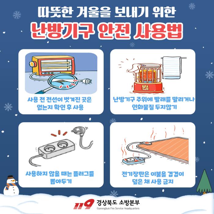 또한, 난방기구 등의 사용으로 인한 화재 발생을 예방하기 위하여 ‘난방기구 사용 전 전선이 벗겨진 곳은 없는지 확인 후 사용’, ‘난방기구 주변에 빨래를 말리거나 인화물질 두지 않기’,‘난방기구를 사용하지 않을 때는 플러그 뽑아두기’, ‘전기장판은 이불을 겹겹이 덮은 채 사용하지 않기’ 등의 안전 수칙을 준수해야 하낟.