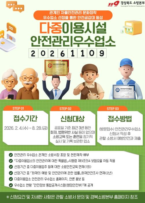 경북도소방본부는 자율안전관리 문화 정착을 위한 ‘다중이용업소 안전관리 우수업소’ 신규 신청을 오는 8월 28일까지 접수한다고 밝혔다.