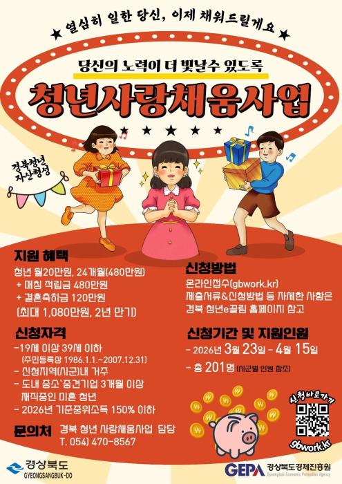 경북도는 중소‧중견기업에 근무하는 청년근로자의 복지향상과 지역정착을 유도하기 위해 ‘경북 청년 사랑채움사업’과 ‘경북 청년 행복카드 지원사업’ 참여자를  23일~ 4월 15일까지 모집한다.