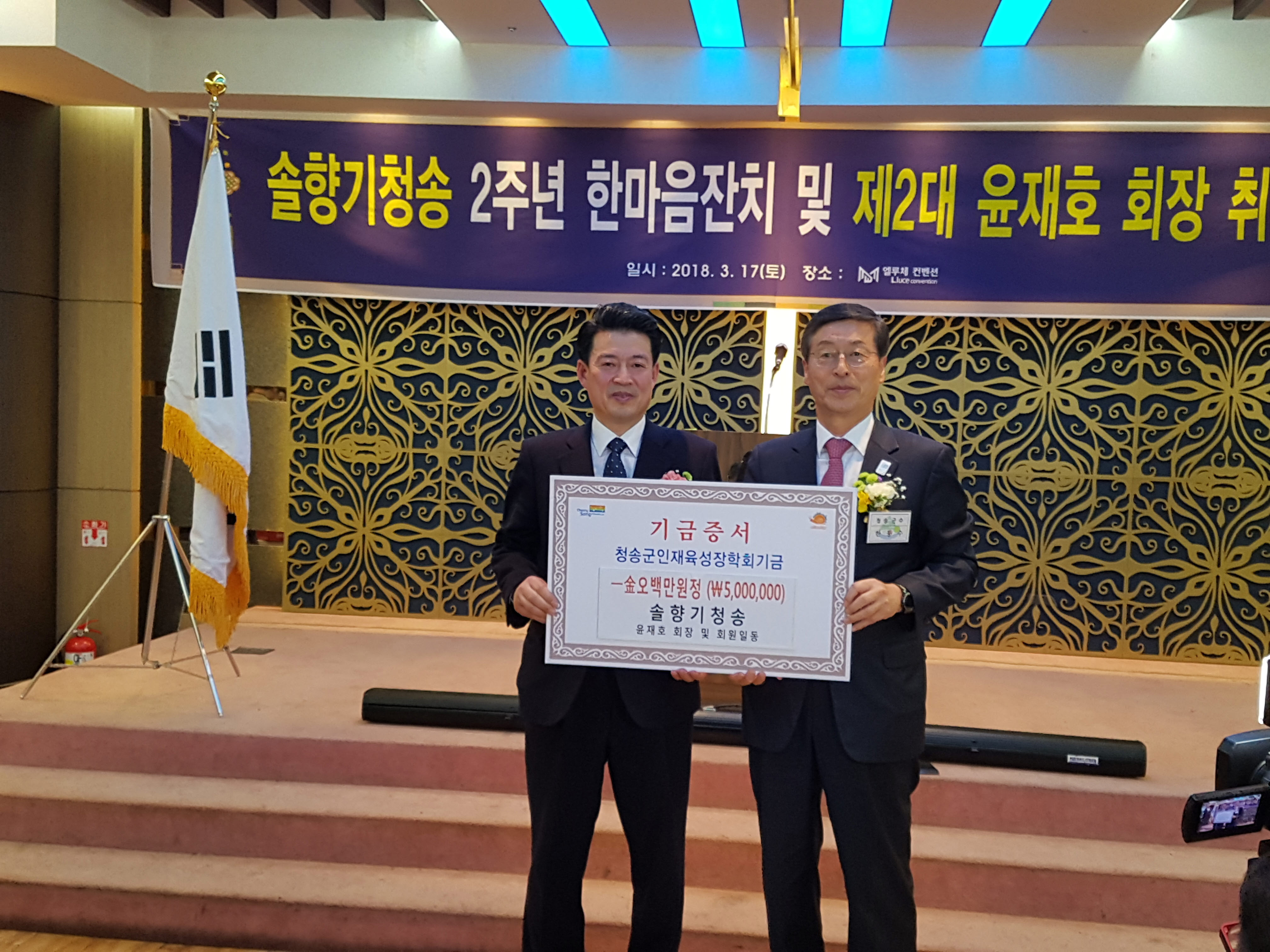 이날 이종보 초대 회장의 뒤를 이어 제 2대 회장으로 취임한 윤재호 회장은 “회원들의 작은 정성을 모아 지역의 인재육성사업에 동참하게 돼 기쁘다.”며, “청송 미래 인재의 꿈을 지원하는데 작은 보탬이 되길 바란다.”고 말했다.