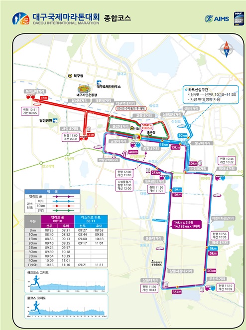 우선 마라톤 코스는 최근 풀코스 동호인의 감소 추세와 장시간 교통통제에 따른 시민불편 사항을 고려하여 마스터즈 풀코스를 폐지하고 하프코스를 일부 변경하였다. 이에 따라 중구지역(태평로·북비산로·서성로) 교통통제 시간이 약 1시간 30분, 수성구지역은 구간에 따라 20분에서 50분 정도 단축되는 것으로 예측되었다.