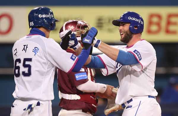 30일 오후 대구 삼성라이온즈파크에서 열린 ‘2018 신한카드 MYCARD KBO리그’ 삼성 라이온즈와 넥센 히어로즈 경기 7회말 1사 1루에서 삼성 러프가 동점 투런 홈런을 쳐 홈을 밟은 후 선행주자 구자욱의 환영을 받고 있다. 삼성 라이온즈 제공