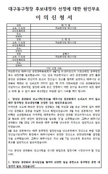 세 명의 후보는 '밀실 공천'이라며 자유한국당 대구시당 공천관리위원회에 원인무효 이의신청을 내기로 했다.
