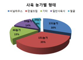 사육형태로는 판넬조립 151농가(35%), 비닐하우스 131농가(30%)가 대부분을 차지하고 있는 것으로 나타났다.