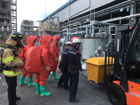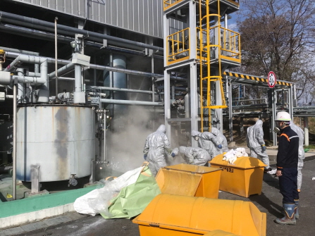 13일 유독가스 탱크가 폭발한 경북 영주시 상줄동 가흥산업단지 내 SK머티리얼즈 가스 생산공장 앞에서 방제복을 입은 회사 직원들이 현장을 수습하고 있다<사진=경북도 제공>