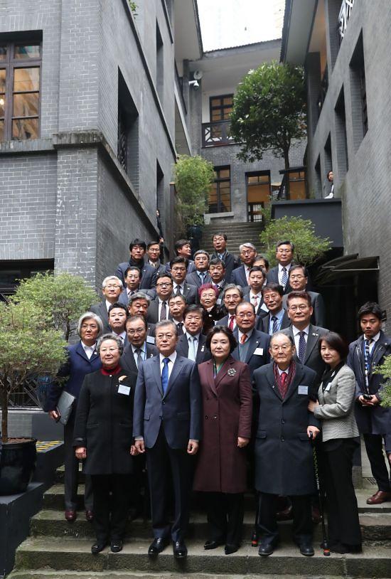 지난해 12월 중국을 국빈 방문한 문재인 대통령이 중국 충칭시 대한민국 임시정부 청사를 찾아 김자동 대한민국 임시정부 기념사업회장등 독립유공자들과 기념촬영을 하고 있다<사진=연합뉴스>