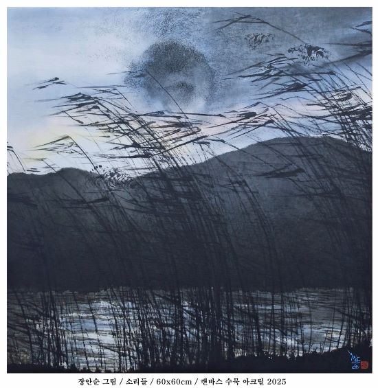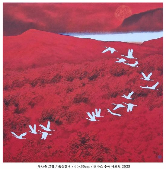 이번 전시에는 갈대가 전하는 생명의 이야기를 담아 순천만을 소개하는 작품이 주류를 이루고 있다. 평범한 소재인 갈대(蘆絮)를 통해 인간의 감정과 자연 세계를 연결하는 독창적인 예술을 선보이고 있다. 그의 붓 끝에서 갈대는 단순한 식물이 아닌 삶의 희로애락을 비추는 생명력 있는 은유로 변모한다. 바람에 흔들리는 갈대의 움직임은 우리 삶의 굴곡을 반영하고, 계절에 따라 변하는 갈대의 모습은 시간의 흐름을 상징한다. 그의 작품은 갈대를 매개로 인간과 자연이 깊이 연결된 순간을 화폭에 담아낸다.